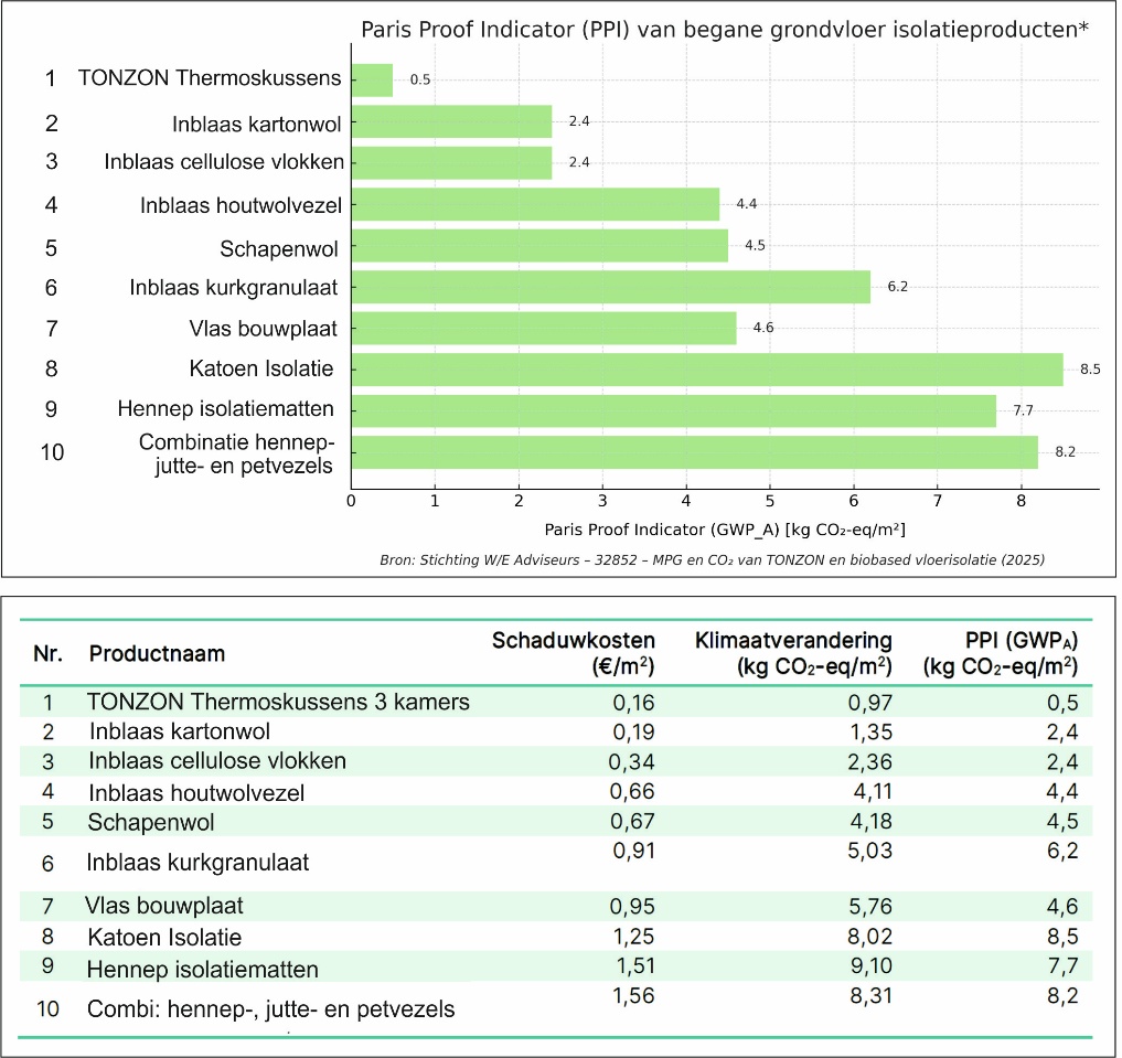 In dit W/E Onderzoek zijn de TONZON Thermoskussens vergeleken met biobased isolatiematerialen. Wanneer we de doelstellingen van Parijs serieus nemen dan is TONZON de meest aangewezen vloerisolatie van dit moment, zoals de grafieken laten zien.
